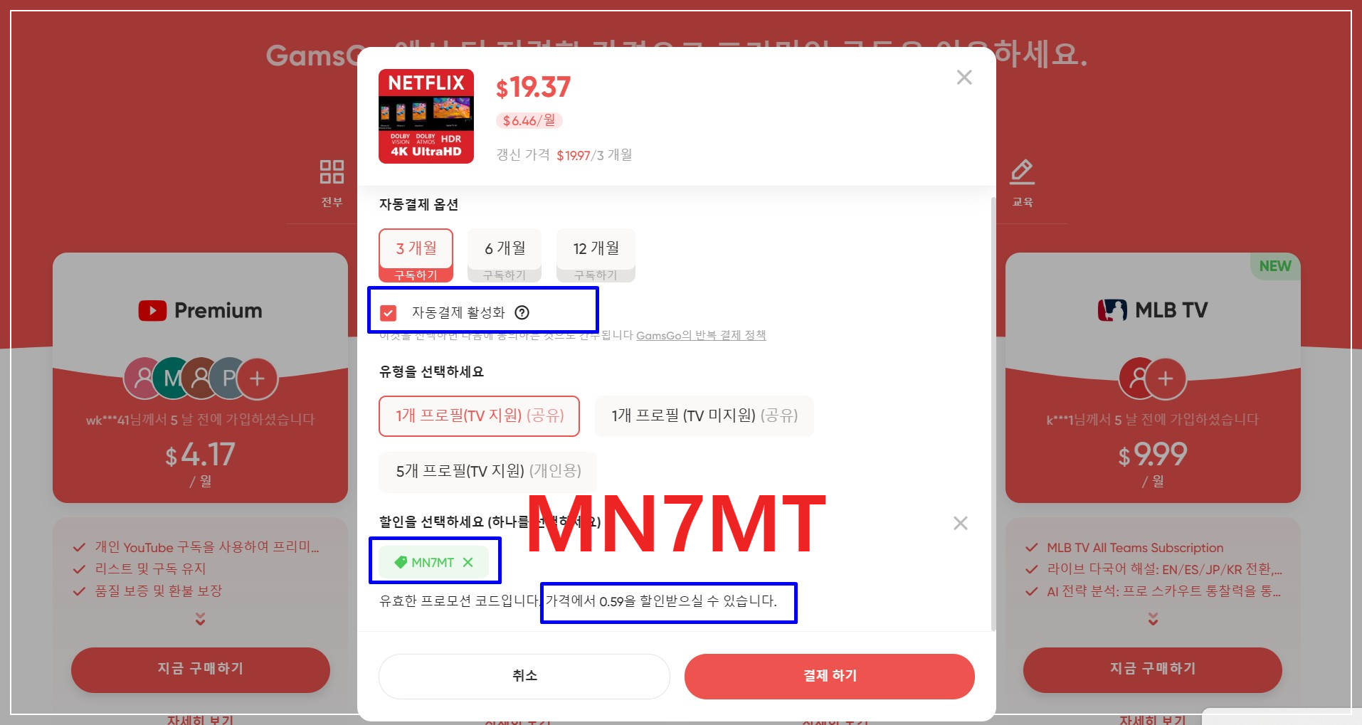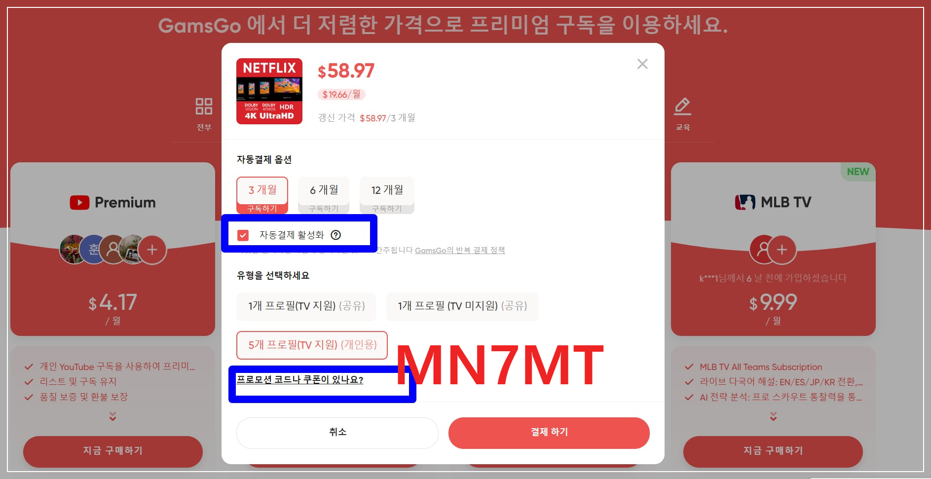- 결제 시 할인코드 MN7MT 입력
