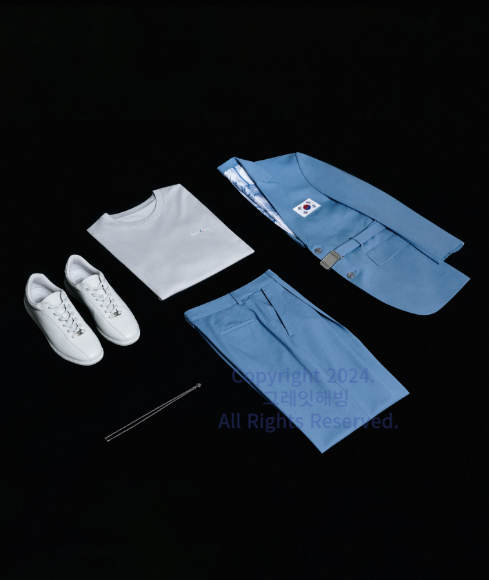 한국 선수단의 단복은 동쪽을 상징하는 청색 중에서도 차분하면서도 깊이 있는 벽청(碧靑)색을 선택하였습니다. 벽청색은 젊음의 기상과 진취적인 정신을 잘 나타내며, 다양한 국가 선수단 사이에서 한국 대표팀이 푸르게 빛나길 바라는 마음이 담겨 있습니다. 이 색상은 한국의 전통적인 아름다움과 현대적 감각을 동시에 표현하며, 선수들이 국제 무대에서 더욱 돋보일 수 있도록 설계되었습니다.