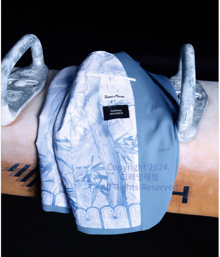 한국 선수단의 단복은 동쪽을 상징하는 청색 중에서도 차분하면서도 깊이 있는 벽청(碧靑)색을 선택하였습니다. 벽청색은 젊음의 기상과 진취적인 정신을 잘 나타내며, 다양한 국가 선수단 사이에서 한국 대표팀이 푸르게 빛나길 바라는 마음이 담겨 있습니다. 이 색상은 한국의 전통적인 아름다움과 현대적 감각을 동시에 표현하며, 선수들이 국제 무대에서 더욱 돋보일 수 있도록 설계되었습니다.