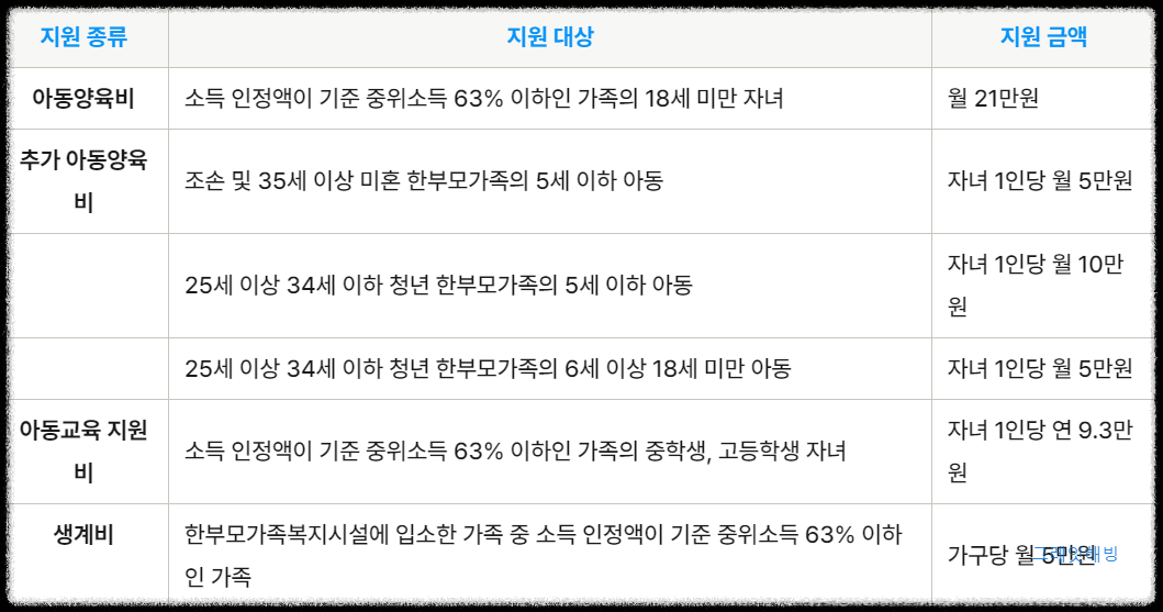 한부모가족증명서 발급 및 복지급여 지급이 이루어지며, 기준 중위소득 63% 이하인 가구에 대해 다음과 같은 지원이 제공됩니다.
