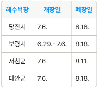 - 충청남도에는 32곳의 해수욕장이 있으며, 6월 29일과 7월 6일에 개장합니다.