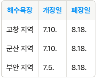 - 전라북도에는 8곳의 해수욕장이 있으며, 7월 5일과 7월 10일에 개장하여 모두 8월 18일에 폐장합니다.