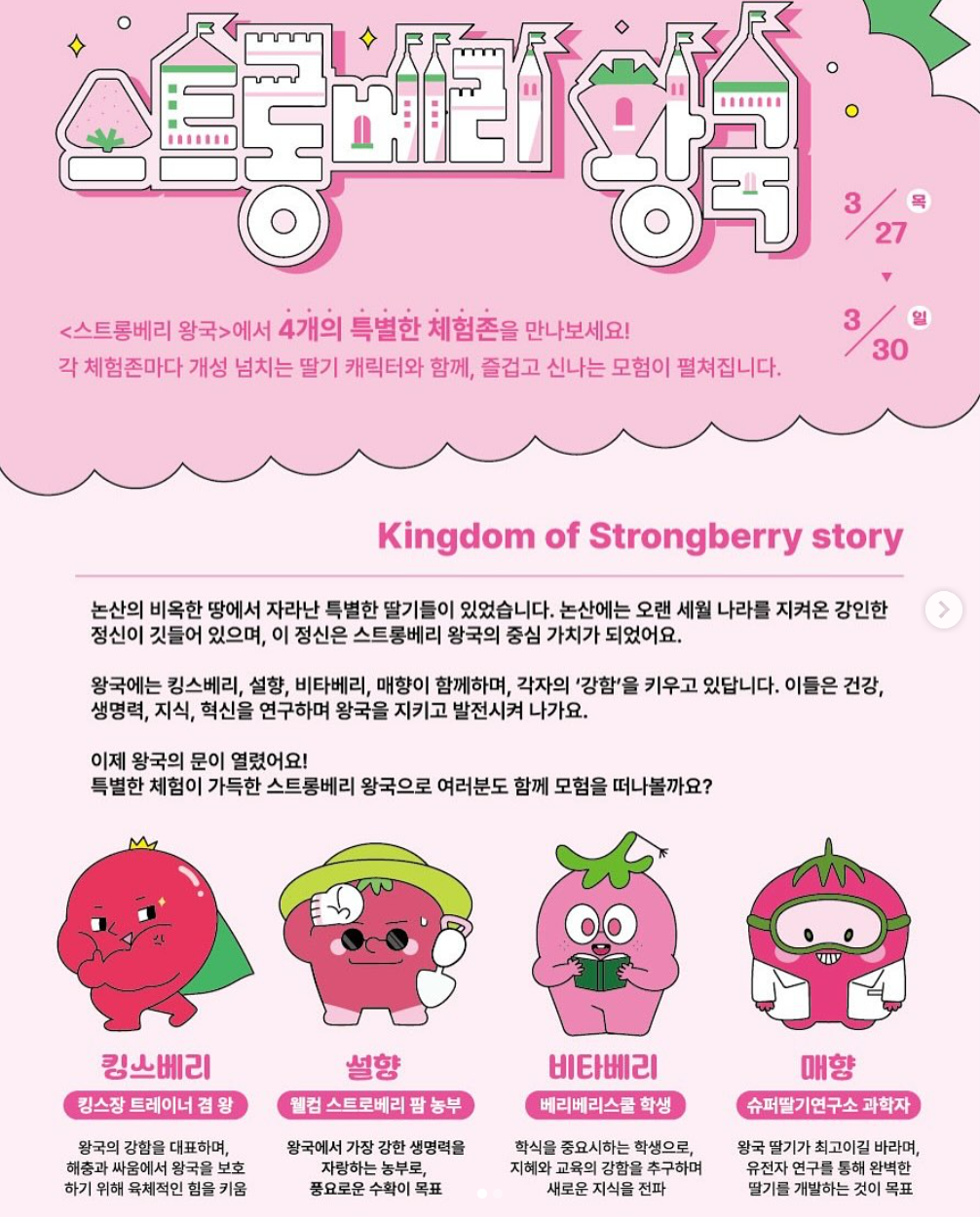 "논산딸기축제는 풍성한 먹거리와 다양한 프로그램으로 따뜻한 봄날의 추억을 선물해 줍니다."